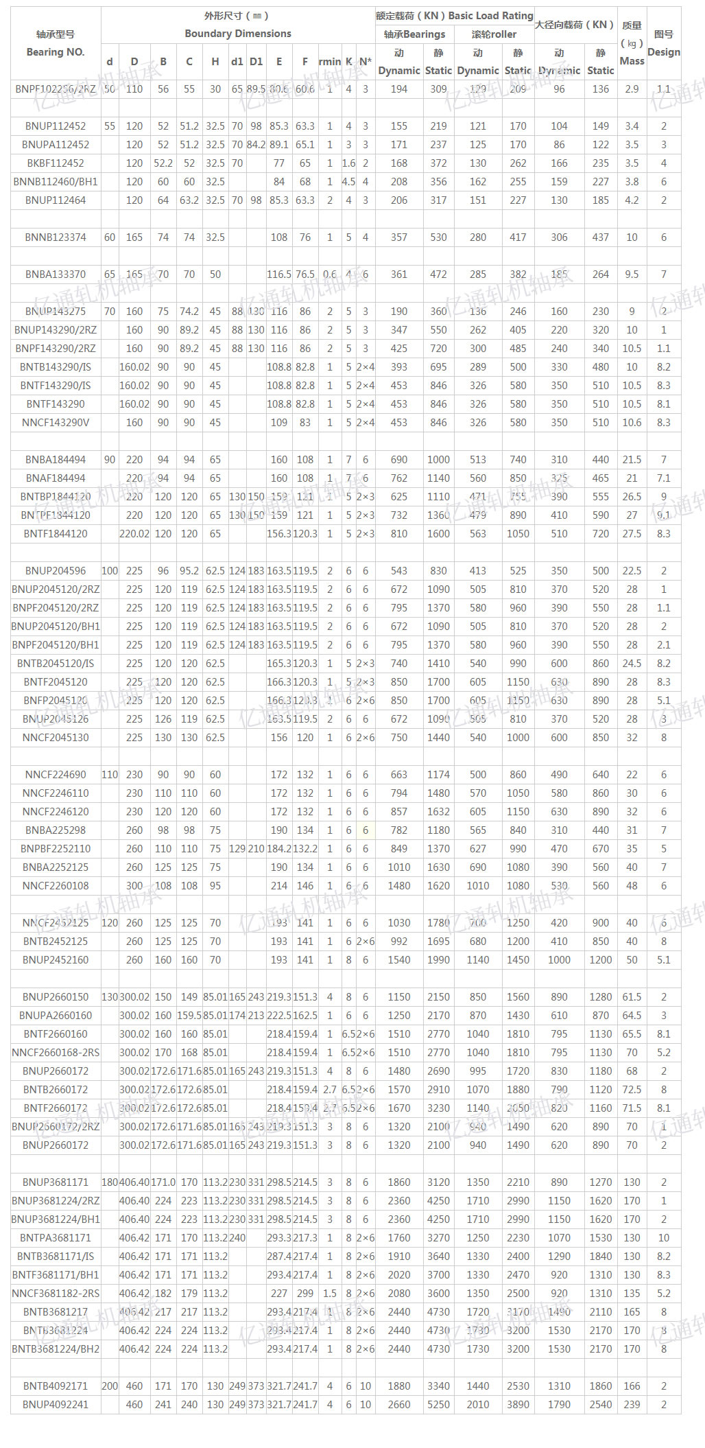 圆柱滚子背衬轴承有两列或三列滚子,有满滚子轴承(无保持架)或带保持架轴承形式,可以带有或不带整体式挡边或挡圈。无挡边轴承的优点在于它们特别简单的几何形状和非常高的径向载荷能力。无挡边或挡圈的圆柱滚子背衬轴承不能承受任何轴向负荷。因此有必要在外圈和支承鞍座侧面之间放置青铜或塑料止推垫圈。带有挡边(或挡圈)的背衬轴承不需要止推垫圈,因为这些轴承的设计使它们能够承受同时作用的径向力和轴向力。圆柱滚子轴承是***常用的背衬轴承。